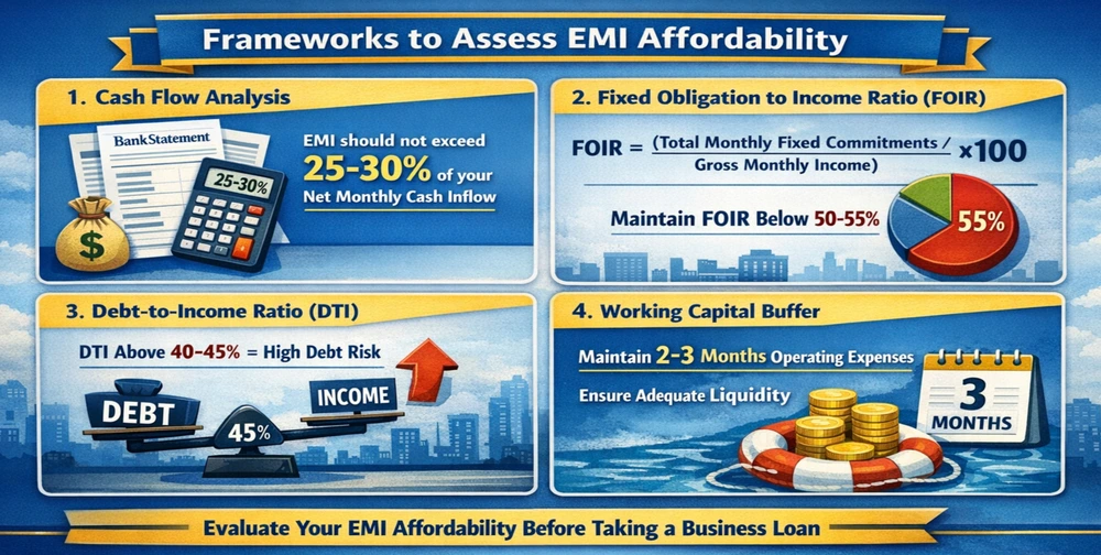The EMI formula calculates monthly payments while the FOIR and DTI frameworks show your current debt level. Business revenue which fluctuates will turn an EMI which appears affordable into financial difficulty.